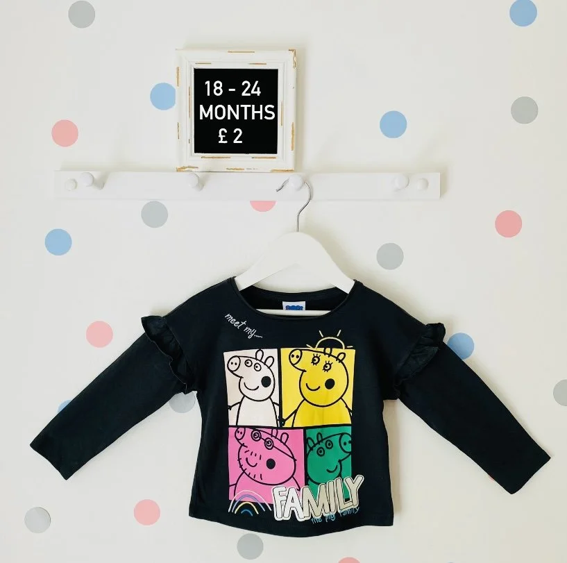 Item Description: Dark grey, long sleeve top with a frill on the shoulder and front motif with the wording ‘Meet my family, the pig family’